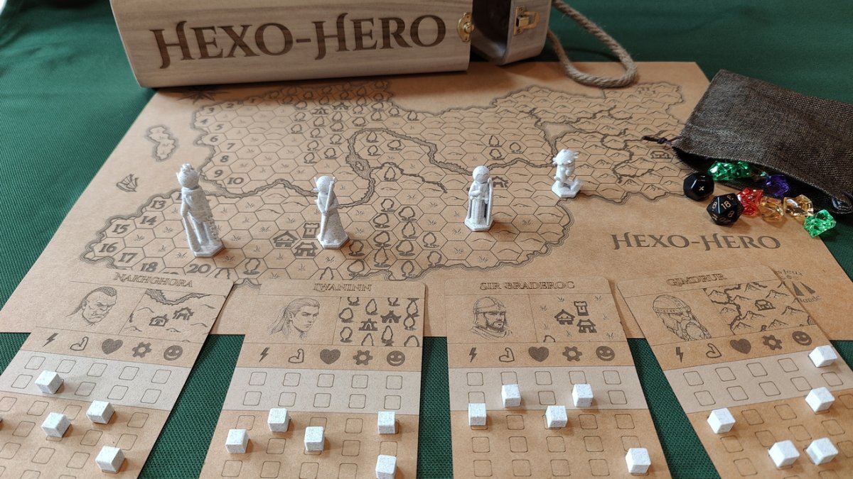 Matériel : Carte de l'île à dérouler en cuir vegan, pions héros, cubes marqueurs, cristaux et dés spéciaux (d12 du Destin et d20).